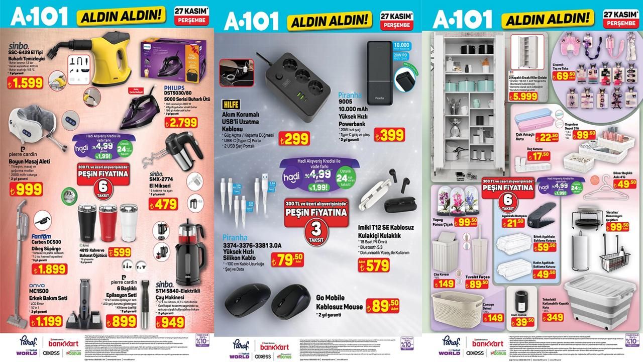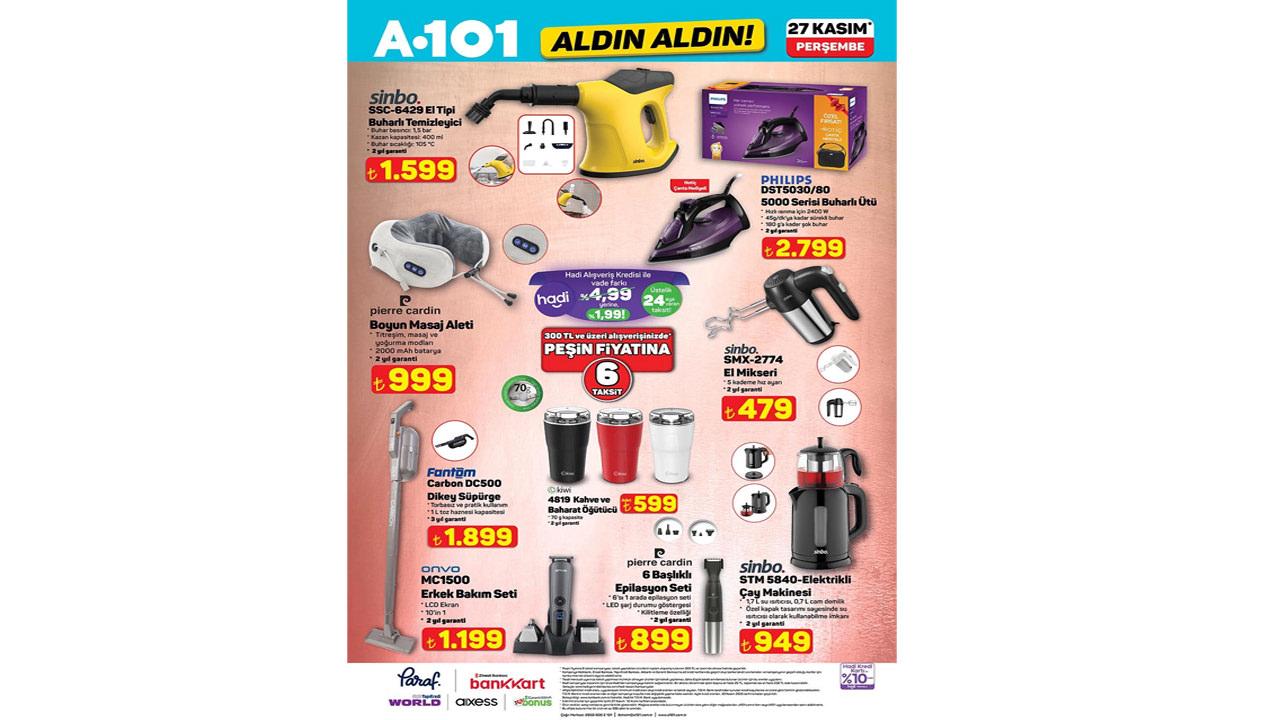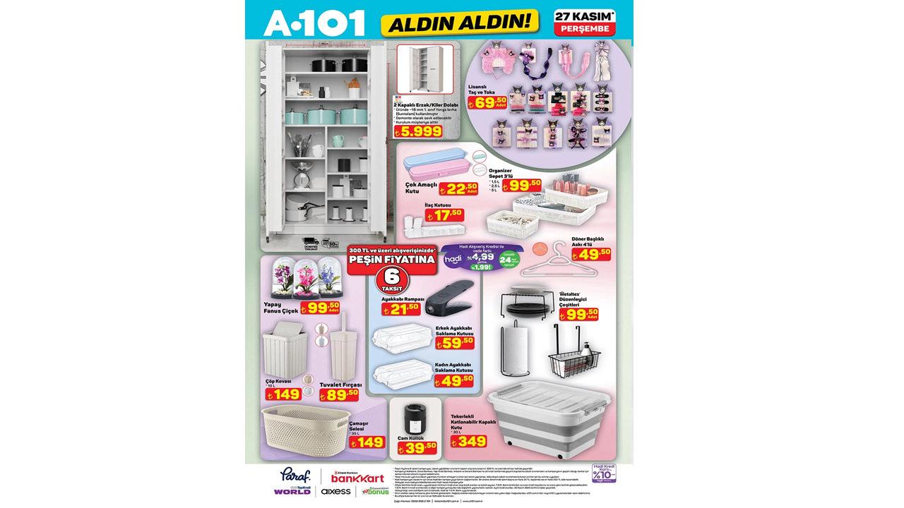 A101'de elektrikli çay makinesi, erkek bakım seti, el mikseri, 6 başlıklı epilasyon seti, 2 kapaklı erzak/kiler dolabı, çok amaçlı kutu, ilaç kutusu, organizer sepet 3'lü, ayakkabı rampası, kadın ve erkek saklama kutusu, döner başlıklı 4'lü askı, çöp kovası, tuvalet fırçası, çamaşır selesi, tekerlekli katlanabilir kapaklı kutu ve düzenleyici çeşitleri cazip fiyatlarla raflarda satışa sunulacak.