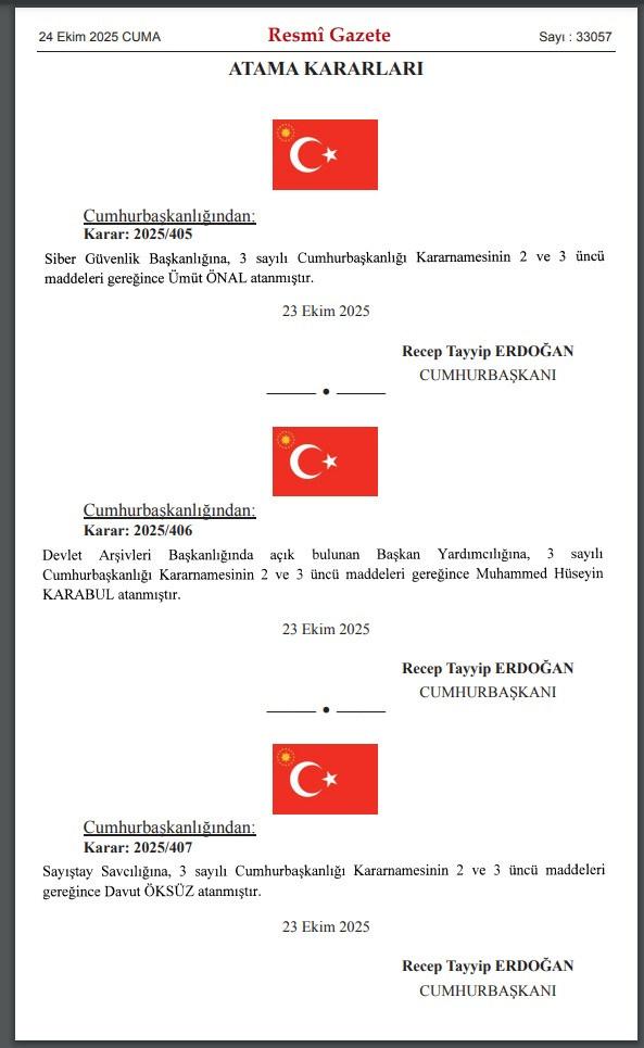 Cumhurbaşkanı Recep Tayyip Erdoğan'ın imzasıyla yayımlanan atama kararlarına göre, 3 sayılı Cumhurbaşkanlığı Kararnamesinin 2 ve 3. maddeleri gereğince, Devlet Arşivleri Başkanlığında açık bulunan Başkan Yardımcılığına Muhammed Hüseyin Karabul ve Sayıştay Savcılığına Davut Öksüz atandı.