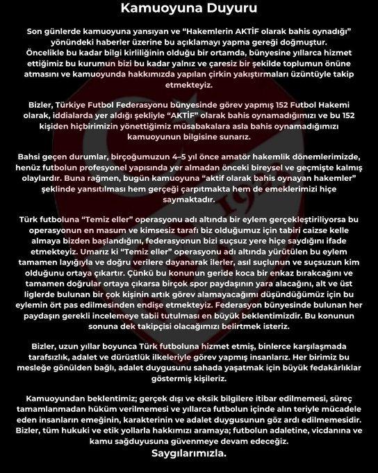'152 futbol hakemi olarak, iddialarda yer aldığı şekilde 'Aktif' olarak bahis oynamadığınızı ve bu 152 kişiden hiçbirimizin yönettiğimiz müsabakalarda asla bahis oynamadığımızı bilginize sunarız.'
