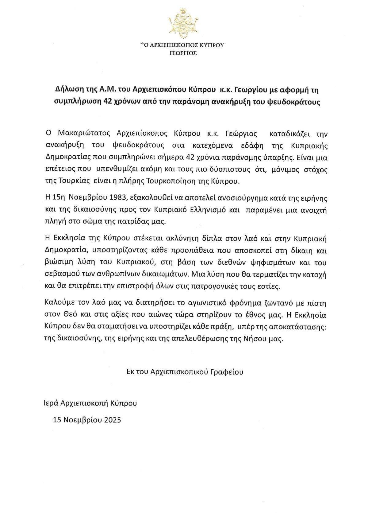 '15 Kasım 1983, Kıbrıs Helenizmine karşı barışa ve adalete yönelik bir hakaret olmaya devam etmekte ve vatanımızın bedeninde açık bir yara olarak kalmaktadır.' ifadesini kullanan Başpiskopos Georgios, mesajının devamında şunları kaydetti: