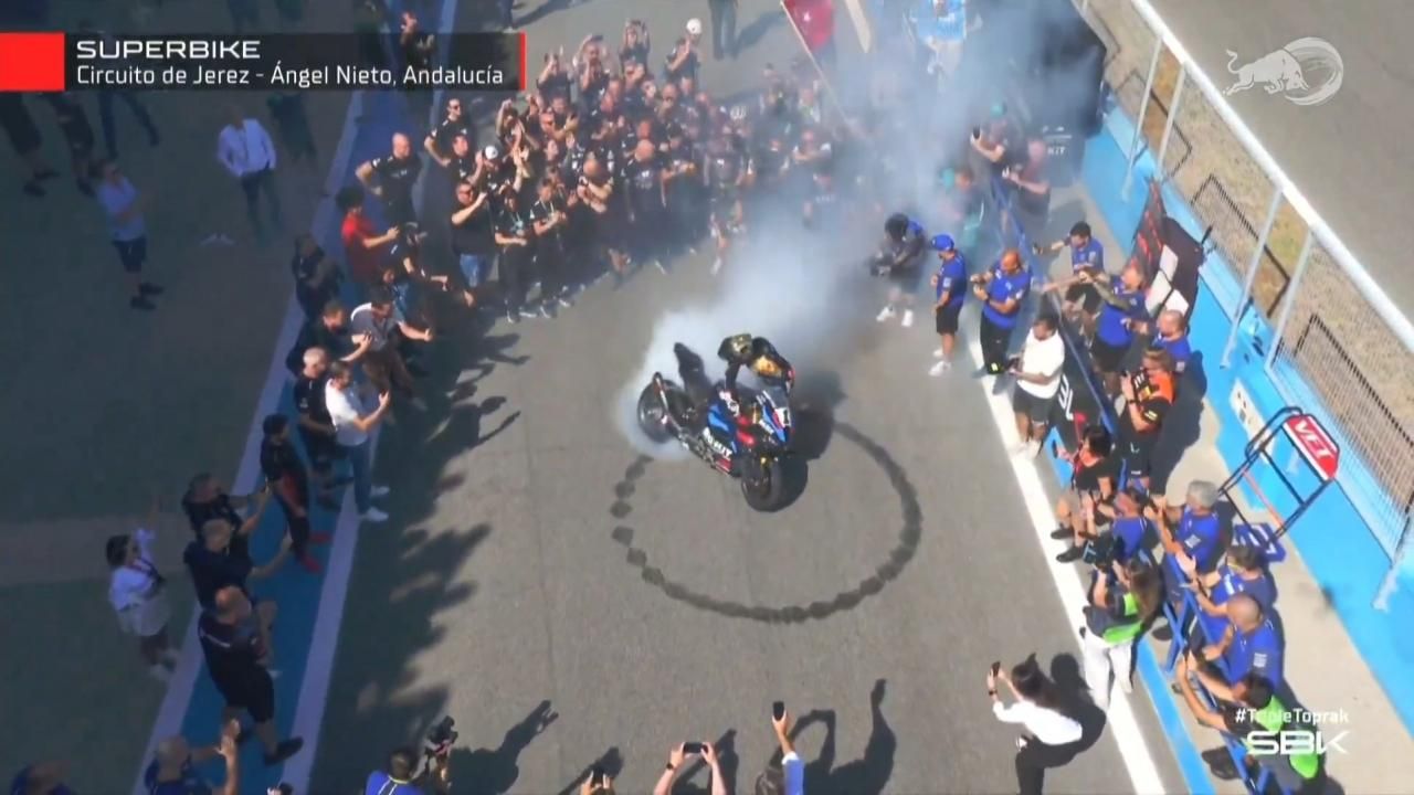 Milli sporcu, takımına ait hangarın önünde lastiğini yakarak şampiyonluğunu kutladı. Takımı da Razgatlıoğlu'nu coşkuyla karşıladı. O anlar sosyal medyada gündem oldu.