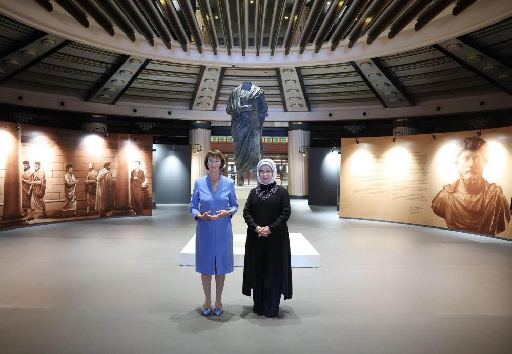 Lider eşleri daha sonra Cumhuriyet tarihinin en kapsamlı arkeoloji projesi 'Geleceğe Miras' kazılarıyla bulunan eserlerin yer aldığı 'Arkeolojinin Altın Çağı Sergisi'ni gezdi. Burdur'daki Boubon Antik Kenti'nde 1960'lı yıllarda yapılan kaçak kazılar sonucu yurt dışına çıkarılan ve 65 yıl aradan sonra Türkiye'ye getirilen, MS 2. ve 3. yüzyıllara tarihlenen Roma İmparatoru Marcus Aurelius bronz heykelin de yer aldığı sergiyi ilgiyle gezen Emine Erdoğan ve Charlotte Merz, eserler hakkında bilgi aldı. Lider eşleri, kütüphane ziyaretinin ardından Devlet Konukevi'ne geçerek burada ikili görüşme gerçekleştirdi.