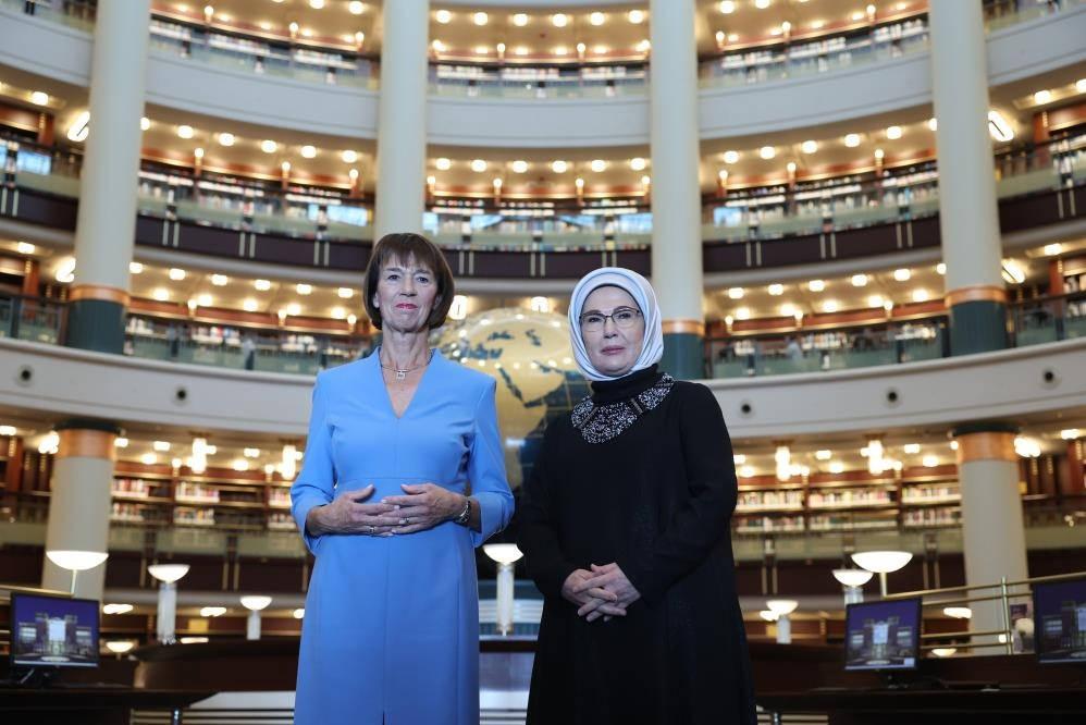 Emine Erdoğan, Charlotte Merz'i kütüphaneye gelişinde kapıda samimi şekilde karşıladı. Kütüphanenin Cihannüma Salonu'na geçen lider eşleri, Almanya Kitaplığı'ndaki eserleri inceledi. Emine Erdoğan, Merz'e Mevlana'nın 'Mesnevi' eserinin Almanca baskısını ve Cumhurbaşkanlığı İletişim Başkanlığınca hazırlanan 'Türkiye' tanıtım kitabını hediye etti.