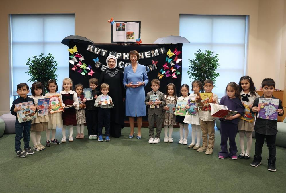 Emine Erdoğan ve Charlotte Merz, Nasreddin Hoca Çocuk Kütüphanesi'ne geçerek burada çeşitli etkinlikler yapan çocuklarla bir araya geldi. Çocukların, 'kodlama' dersi kapsamında yaptıkları basit elektrik devresi çalışmalarını ve gezegen şeklindeki gece lambası tasarımlarını inceleyen lider eşleri, çocuklarla etkinliklerine ilişkin sohbet etti. Lider eşleri, çocukların, oyun hamurlarından yaptıkları gezegenler ve dünyanın katmanları çalışmalarını da inceledi. Çocuklar, Emine Erdoğan ve Charlotte Merz'e, ayın yüzeyini gösteren tablo çalışmalarını hediye etti.