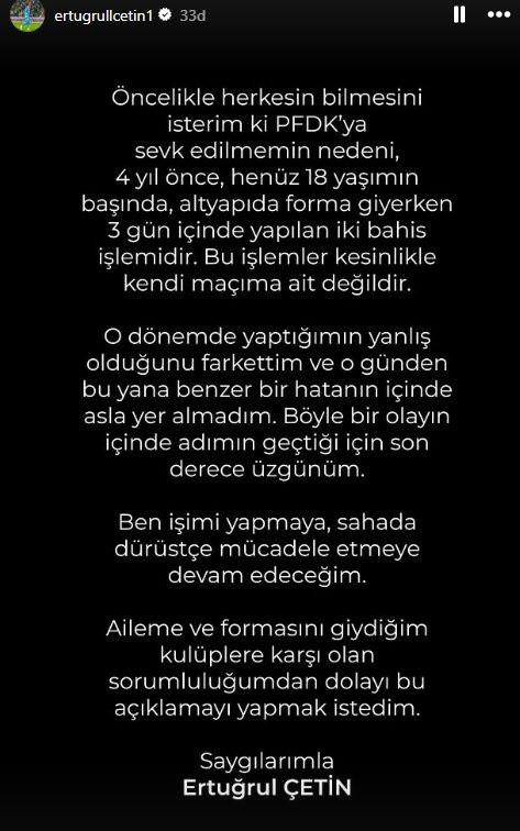 'Öncelikle herkesin bilmesini isterim ki PFDK'ya sevk edilmemin nedeni, 4 yıl önce, henüz 18 yaşımın başında, altyapıda forma giyerken 3 gün içinde yapılan iki bahis işlemidir. Bu işlemler kesinlikle kendi maçıma ait değildir. O dönemde yaptığımın yanlış olduğunu fark ettim ve o günden bu yana benzer bir hatanın içinde asla yer almadım. Böyle bir olayın içinde adımın geçtiği için son derece üzgünüm. Ben işimi yapmaya, sahada dürüstçe mücadele etmeye devam edeceğim. Aileme ve formasını giydiğim kulüplere karşı olan sorumluluğumdan dolayı bu açıklamayı yapmak istedim.' ifadelerini kullandı.