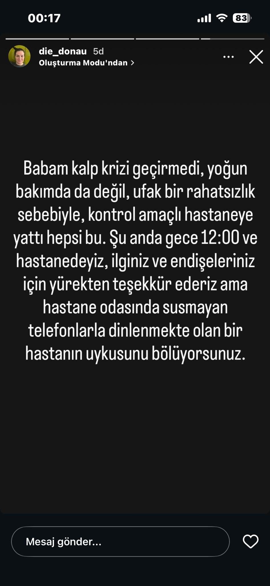 'Babam kalp krizi geçirmedi, yoğun bakımda da değil, ufak bir rahatsızlık sebebiyle, kontrol amaçlı hastaneye yattı hepsi bu. Şu anda gece 12:00 ve hastanedeyiz, ilginiz ve endişeleriniz için yürekten teşekkür ederiz ama hastane odasında susmayan telefonlarla dinlenmekte olan bir hastanın uykusunu bölüyorsunuz.'