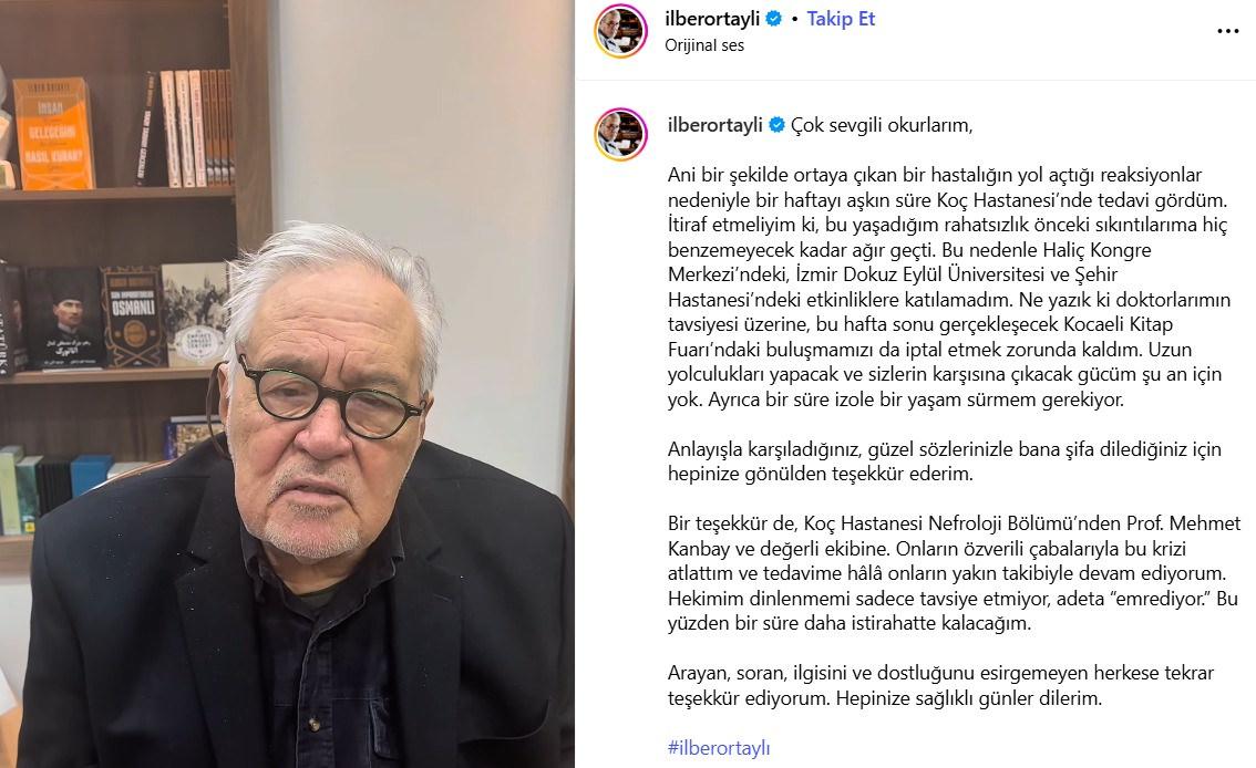 Geçen günlerde kalp krizi geçirerek hastaneye kaldırıldığı iddia edilen tarihçi Prof. Dr. İlber Ortaylı'dan sağlık durumu hakkında paylaşım geldi. Ani bir şekilde rahatsızlandığını belirten Ortaylı, 'İtiraf etmeliyim ki, bu yaşadığım rahatsızlık önceki sıkıntılarıma hiç benzemeyecek kadar ağır geçti.' dedi. Programlarını iptal etmek zorunda kaldığını söyleyen Ortaylı, 'Ne yazık ki doktorlarımın tavsiyesi üzerine, bu hafta sonu gerçekleşecek Kocaeli Kitap Fuarı'ndaki buluşmamızı da iptal etmek zorunda kaldım. Uzun yolculukları yapacak ve sizlerin karşısına çıkacak gücüm şu an için yok. Ayrıca bir süre izole bir yaşam sürmem gerekiyor.' ifadelerini kullandı.