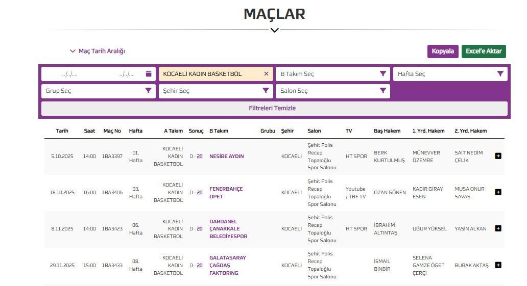 Ligin 8. haftasında yarın saat 15.00'te Kocaeli Şehit Polis Recep Topaloğlu Spor Salonu'nda oynanması planlanan Kocaeli Kadın Basketbol - Galatasaray müsabakası, Türkiye Basketbol Federasyonu tarafından sisteme sarı-kırmızılıların hükmen 20-0 galibiyeti olarak işlendi. Öte yandan Kocaeli ekibinin tamamlanmış tüm maçları da TBF tarafından sisteme hükmen 20-0 mağlubiyet olarak yazıldı.