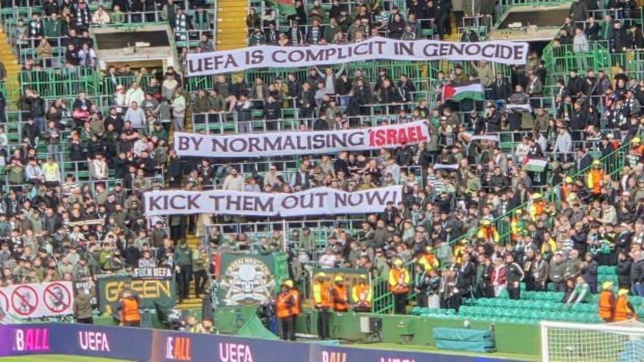 Celticli taraftarların açtıkları pankartlarda 'UEFA, israil'i normalleştirerek soykırıma ortak oluyor.' ve 'Onları hemen atın.' mesajları yer aldı.
