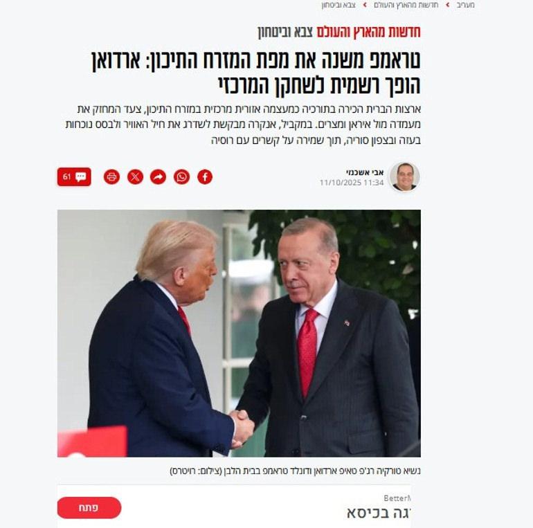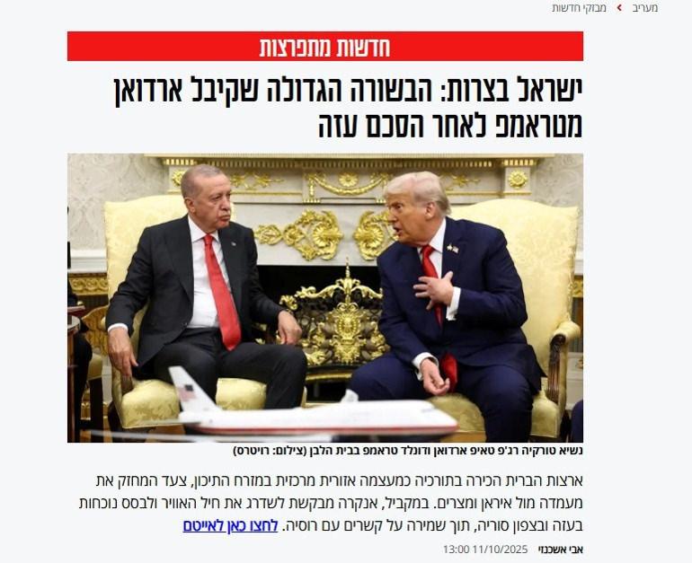 İsrail'in en büyük gazetelerinden biri olan Maariv, 'İsrail'in başı belada: Gazze anlaşmasının ardından Erdoğan'ın Trump'tan aldığı büyük haber' başlıklı analizinde, Amerika Birleşik Devletleri'nin Türkiye'yi 'Orta Doğu'nun merkezi bölgesel gücü' olarak tanıdığını belirtti ve bu durumun Ankara'nın konumunu daha da güçlendirdiğini yazdı.