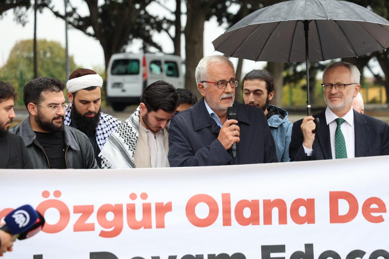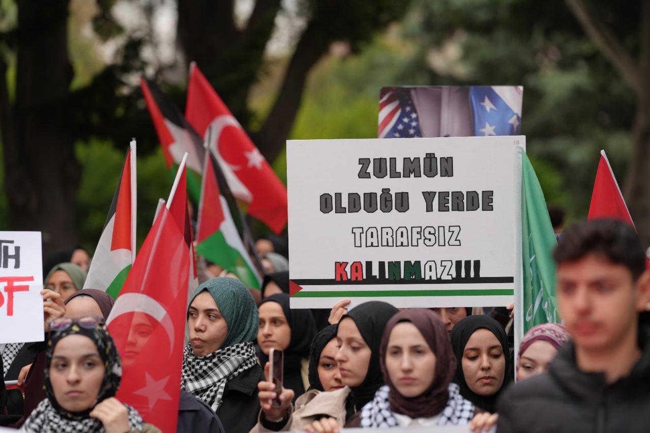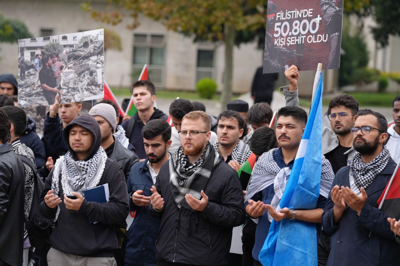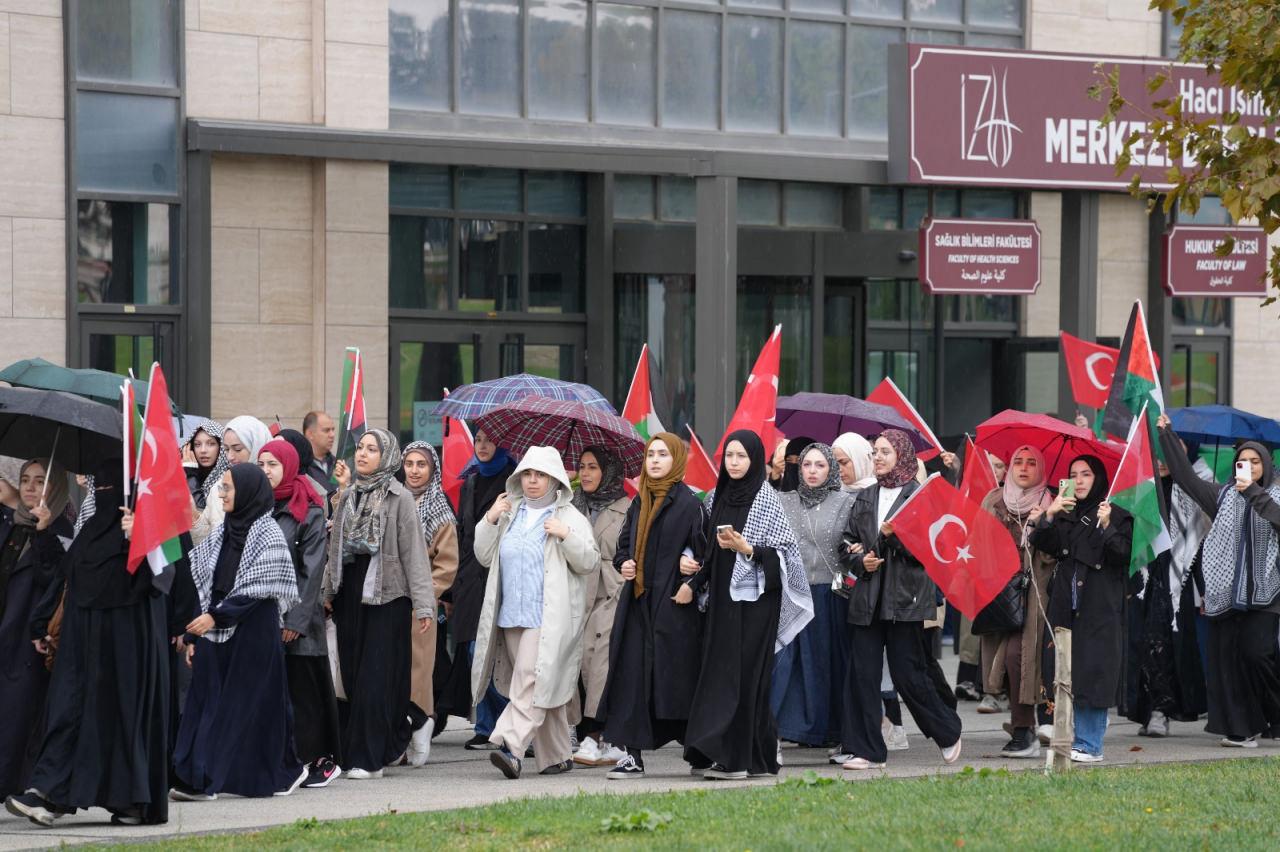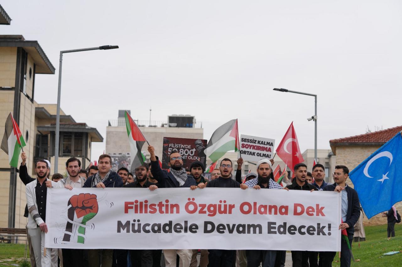 Üniversitenin Halkalı'daki kampüsünde yürüyüş gerçekleştiren öğrenciler, yaptıkları basın açıklamasında soykırımın durdurulması için artık somut adımlar atılması gerektiğini dile getirdi.