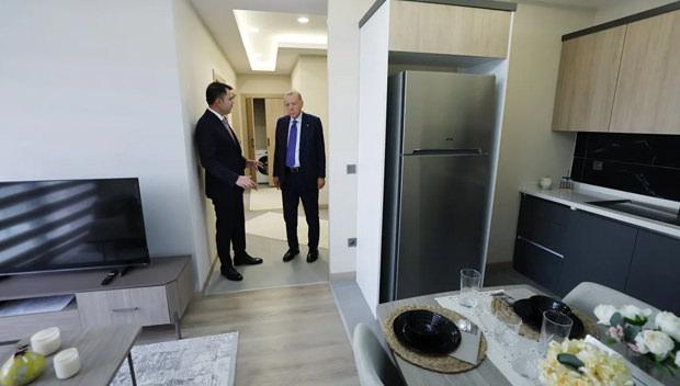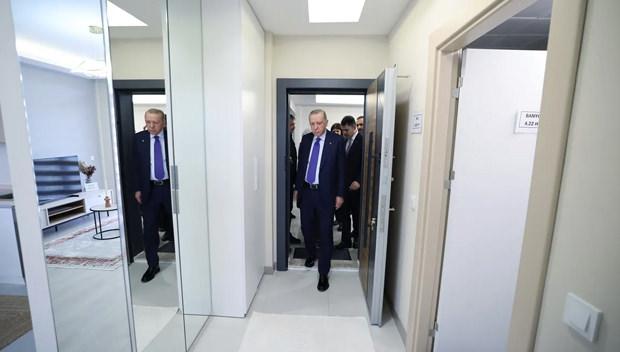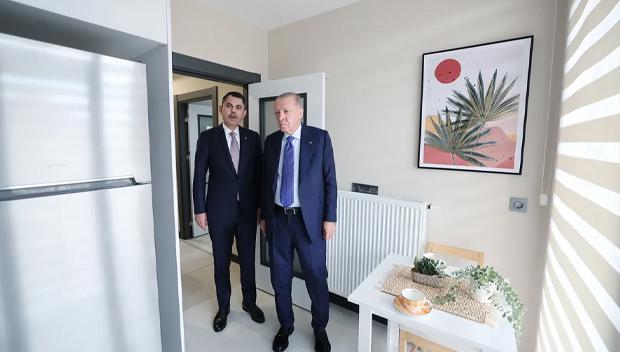 Cumhurbaşkanı Recep Tayyip Erdoğan, Çevre, Şehircilik ve İklim Değişikliği Bakanı Murat Kurum ile birlikte vatandaşlara teslim edilecek örnek daireyi inceledi.