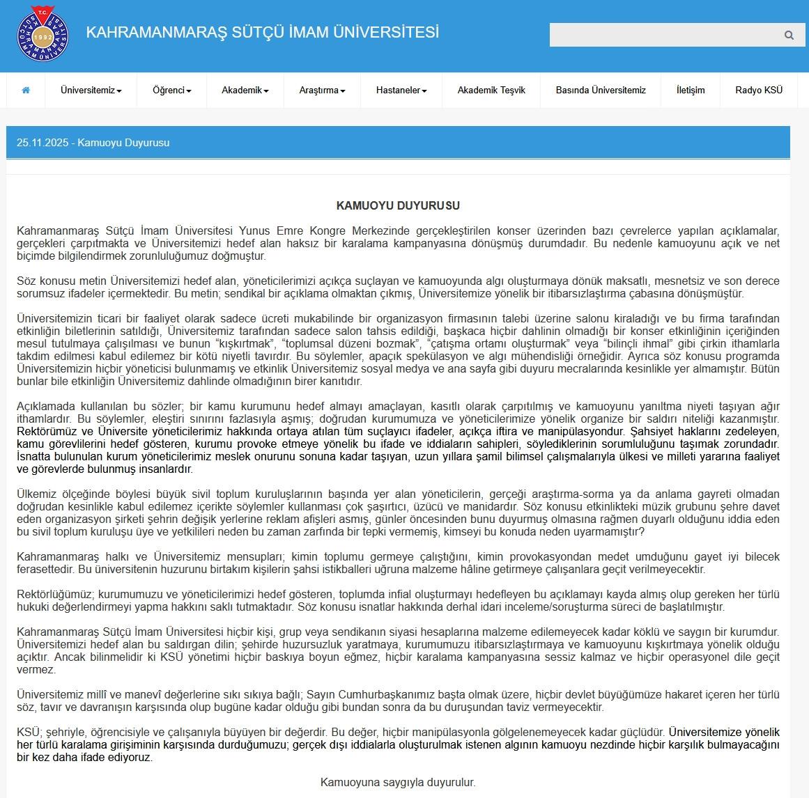 'Kahramanmaraş Sütçü İmam Üniversitesi Yunus Emre Kongre Merkezinde gerçekleştirilen konser üzerinden bazı çevrelerce yapılan açıklamalar, gerçekleri çarpıtmakta ve Üniversitemizi hedef alan haksız bir karalama kampanyasına dönüşmüş durumdadır. Bu nedenle kamuoyunu açık ve net biçimde bilgilendirmek zorunluluğumuz doğmuştur.