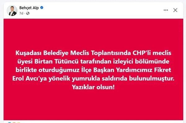 Olay, meclis toplantısı sırasında izleyici bölümünde yaşandı. İYİ Parti Kuşadası İlçe Başkanı Behçet Alp, sosyal medya hesabından yaptığı açıklamada saldırıyı kınadı. Alp paylaşımında şu ifadeleri kullandı: 'Kuşadası Belediye Meclis Toplantısında CHP'li meclis üyesi Birtan Tütüncü tarafından, izleyici bölümünde birlikte oturduğumuz İlçe Başkan Yardımcımız Fikret Erol Avcı'ya yönelik yumrukla saldırıda bulunulmuştur. Yazıklar olsun!'