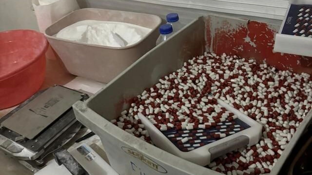 Mersin İl Emniyet Müdürlüğü Narkotik Suçlarla Mücadele Şube Müdürlüğü ile Mezitli İlçe Emniyet Müdürlüğü ekipleri, uyuşturucu ticaretini engellemeye yönelik çalışmalar kapsamında Yenişehir ilçesinde sentetik ecza hap üretimi yapıldığı bilgisine ulaştı. Belirlenen adrese düzenlenen operasyonda, 65 kilo 250 gram pregabalin, 45 bin 482 doldurulmuş kapsül, 135 bin 100 boş kapsül, bin 850 ilaç kutusu, 25 gram metamfetamin, 810 beyaz renkli hap kutusu, 420 kapak, 2 ilaç basım makinesi, 1 mikser ve 9 bin 912 adet sentetik ecza ele geçirildi.
