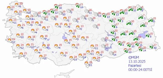 13 Ekim Pazartesi ve 14 Ekim Salı günleri, yağışlı sistemin ana etkisi doğu bölgelerde yoğunlaşacak. Pazartesi gecesi ve Salı günü Doğu ve Güneydoğu Anadolu'da kuvvetli yağış ve yükseklerde kar yağışı devam edecek. Ülkenin batı, Marmara ve Ege bölgeleri ise parçalı bulutlu ve genellikle yağışsız bir hava ile geçecek.