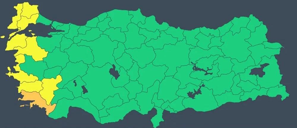 Aydın, Balıkesir, Çanakkale, Denizli, Edirne, İzmir, Kırklareli, Tekirdağ'a sarı, Muğla'ya ise turuncu kodlu uyarı yapan MGM, sel ve su baskınlarına karşı dikkatli olunması gerektiğini belirtti.