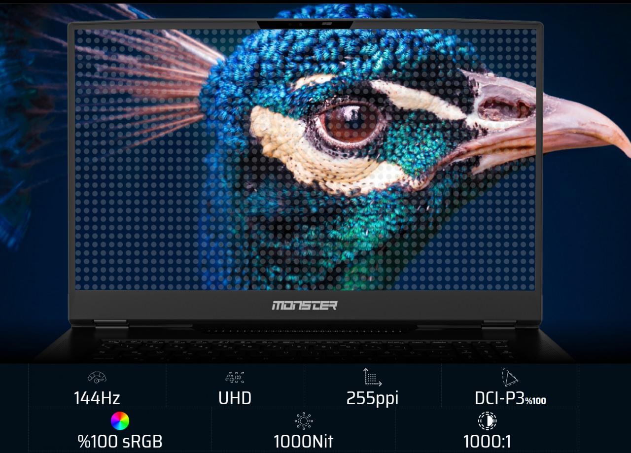 Monster, bu modelde 17,3 inç büyüklüğünde 4K UHD IPS bir panel kullanıyor. 144 Hz yenileme hızı, %100 DCI-P3 renk doğruluğu, HDR desteği ve 1000 nit parlaklık değeri ile ekran, özellikle video düzenleme ve renk düzeltme işleri yapan profesyoneller için büyük avantaj sağlıyor.