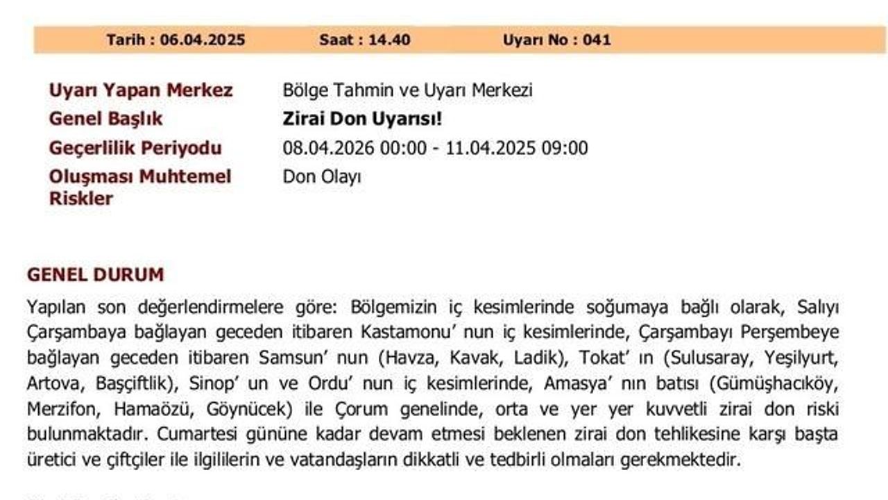 Yetkililer, hava sıcaklıklarındaki düşüşün tarımsal üretimi olumsuz etkileyebileceğine dikkat çekerek, çiftçilerin ve üreticilerin gerekli tedbirleri almaları gerektiğini vurguladı. Zirai donun hafif, orta ve kuvvetli olarak sınıflandırıldığı açıklamada, kuvvetli donun -4,4 derecenin altındaki sıcaklıklarda gerçekleştiği ifade edildi. Meteoroloji uzmanları, özellikle gece saatlerinde sıcaklıkların daha da düşeceğini belirterek, tarım alanlarında koruyucu önlemlerin alınmasını önerdi.