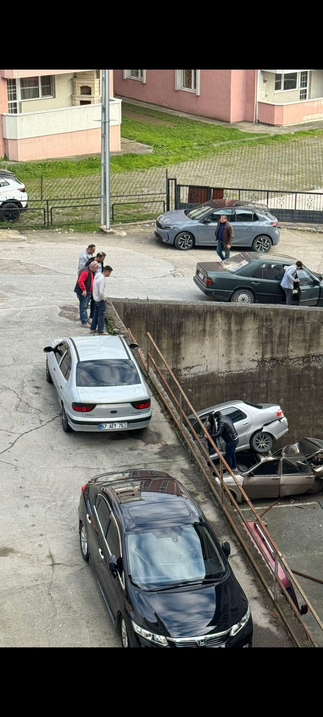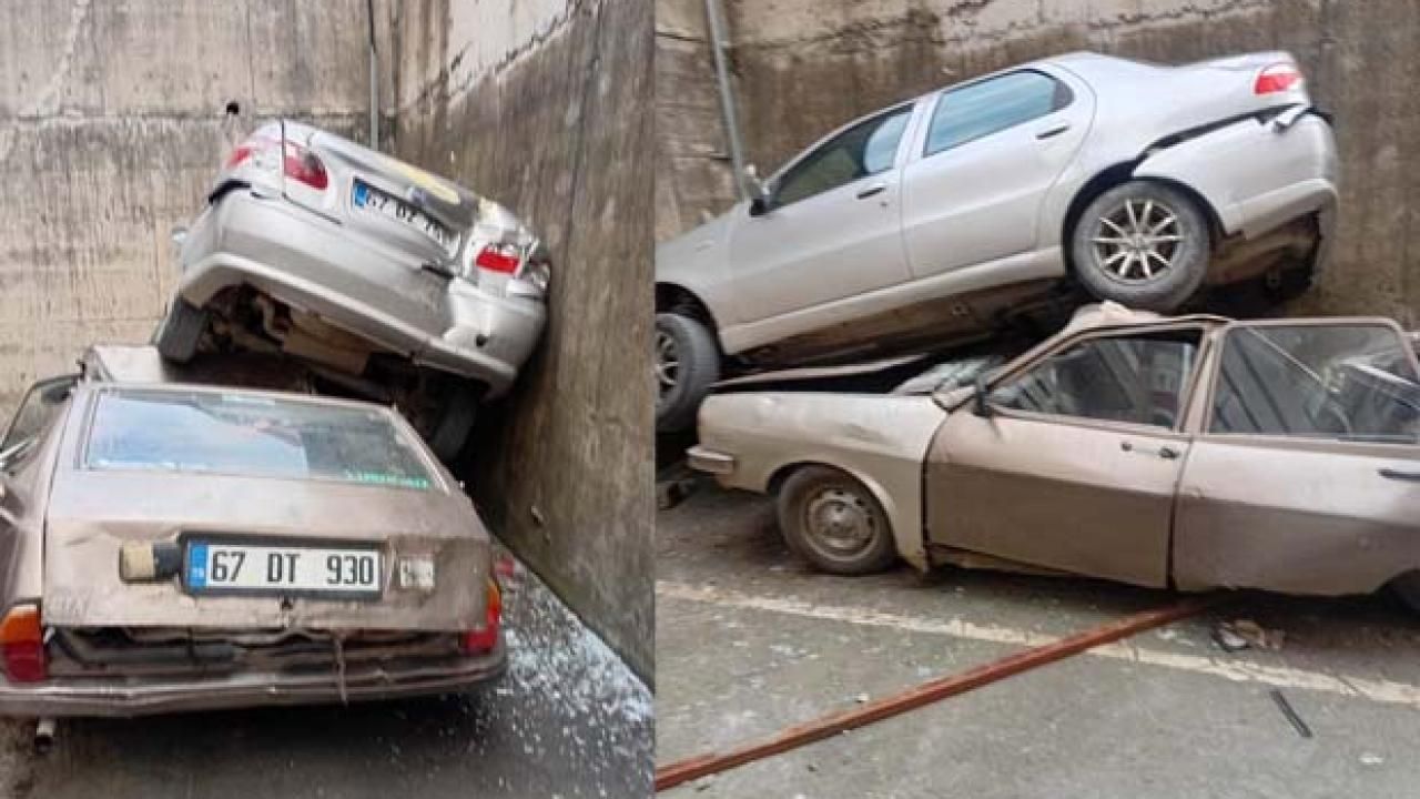 Sürücünün direksiyon hâkimiyetini kaybetmesiyle araç, yaklaşık 8 metre yükseklikten istinat duvarını aşarak alt bölümde park halinde bulunan bir otomobilin üzerine düştü.