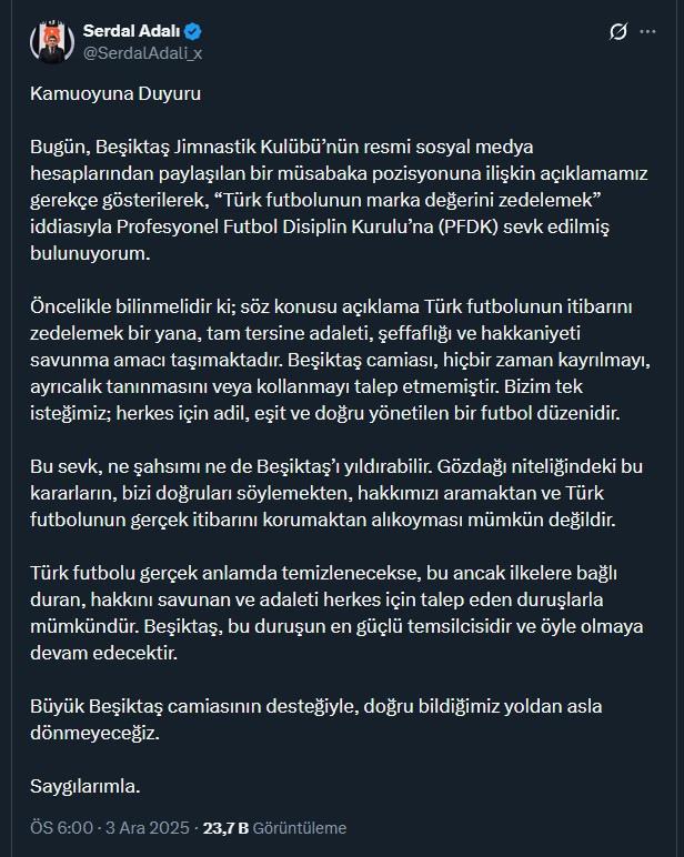 Beşiktaş Başkanı Serdal Adalı, konuyla ilgili sosyal medya hesabından bir açıklama yaptı. Adalı, 'Bu PFDK sevki ne şahsımı, ne Beşiktaş'ı yıldırabilir. Doğru bildiğimiz yoldan asla dönmeyeceğiz.' ifadelerine yer verdi.