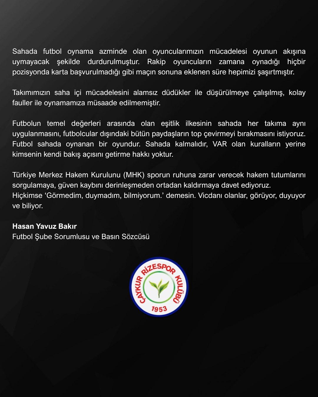 Karşılaşmanın ardından Çaykur Rizespor kulübü maçtaki hakem kararlarına ve Merkez Hakem Kurulu'na sert tepki gösterdi.