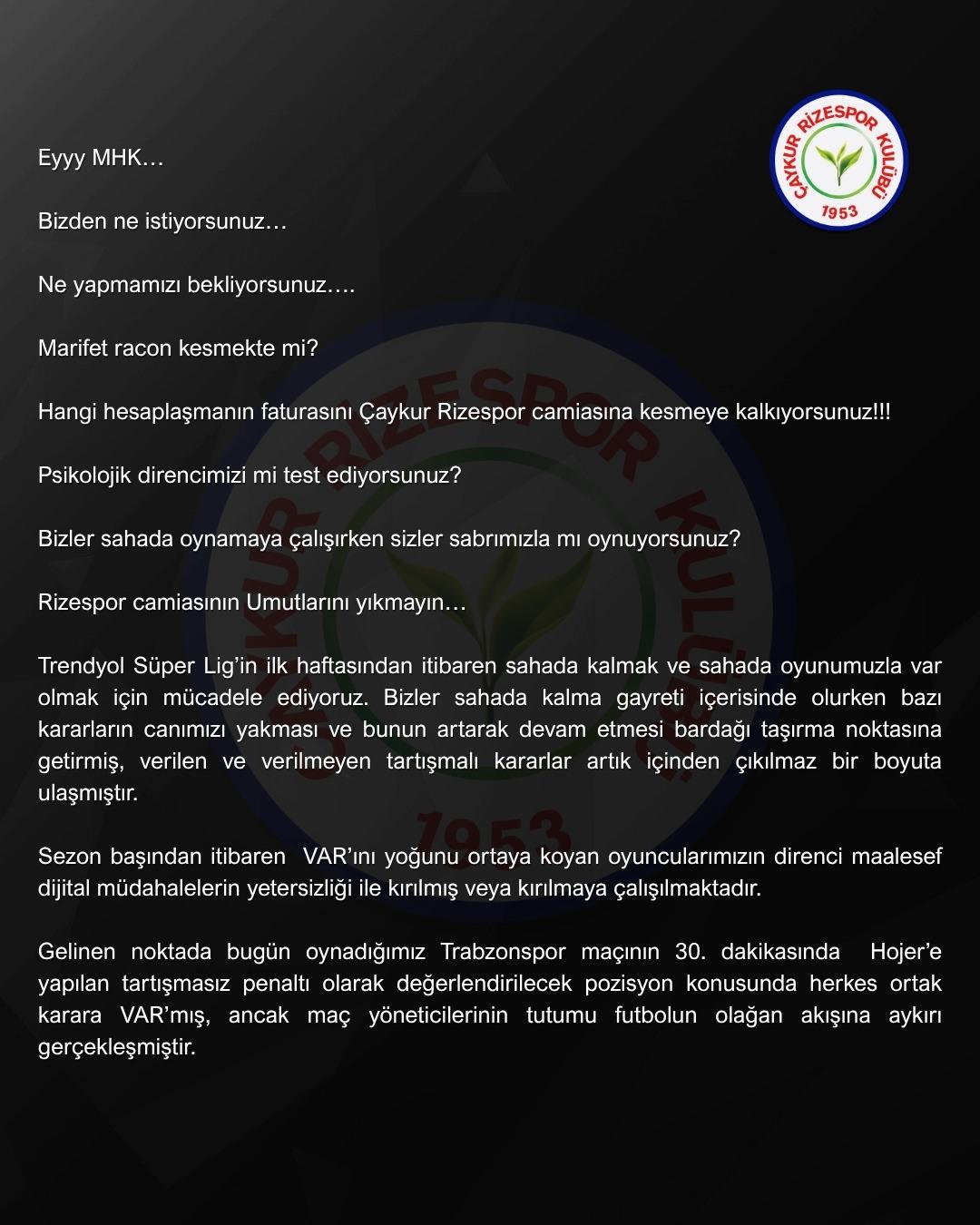 Tüm Spor - Trendyol Süper Lig ekiplerinden Çaykur Rizespor, 2-1 kaybettikleri Trabzonspor maçının ardından MHK'ye tepki gösterdi.