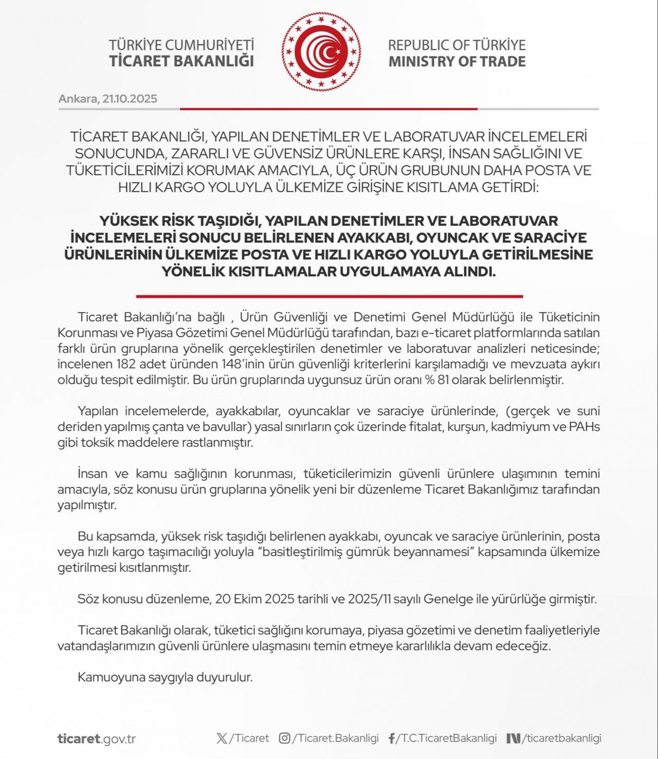 Ticaret Bakanlığı, yapılan denetimler ve laboratuvar incelemeleri sonucunda insan sağlığına zararlı ve güvensiz olduğu belirlenen bazı ürün gruplarına yönelik yeni düzenleme getirdi.Bakanlık, tüketici güvenliğini sağlamak amacıyla ayakkabı, oyuncak ve saraciye ürünlerinin posta ve hızlı kargo yoluyla Türkiye'ye girişine kısıtlama uygulamaya başladı.