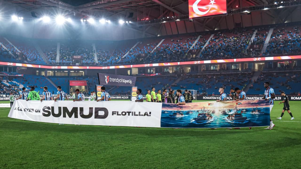 Bordo-mavili taraftarlar, kale arkasına 'Gazze'de hayat var, vicdanlarda sızı' ve 'Sumudumuz Gazze'ye' yazılı pankartlar astı. Trabzonsporlu futbolcular da sahaya 'All Eyes Sumud Flotilla (Tüm Gözler Sumud Filosu'nda) ' yazılı pankart ile sahaya çıktı.
