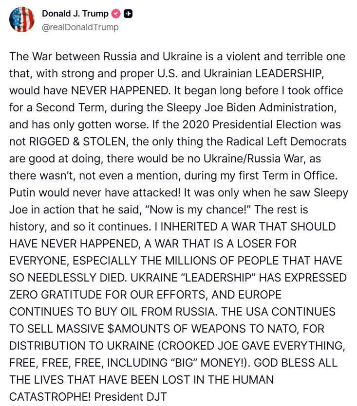 Trump, 'Rusya ve Ukrayna arasındaki savaş, güçlü ve düzgün bir ABD ve Ukrayna liderliği olsaydı asla olmazdı' diyerek, 'Asla olmaması gereken, herkesin kaybettiği, özellikle gereksiz yere milyonlarca insanın öldüğü bir savaşı miras aldım.' şeklinde konuştu. Trump ayrıca, 'Ukrayna liderliği çabalarımız için hiçbir minnet duymadı.' ifadelerini kullandı.