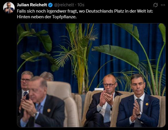 Alman gazeteci Julian Reichelt yaptığı paylaşıma 'Almanya'nın dünyadaki yeri neresi diye merak eden varsa: Saksı bitkisinin arkasında.' ifadelerini not düştü.