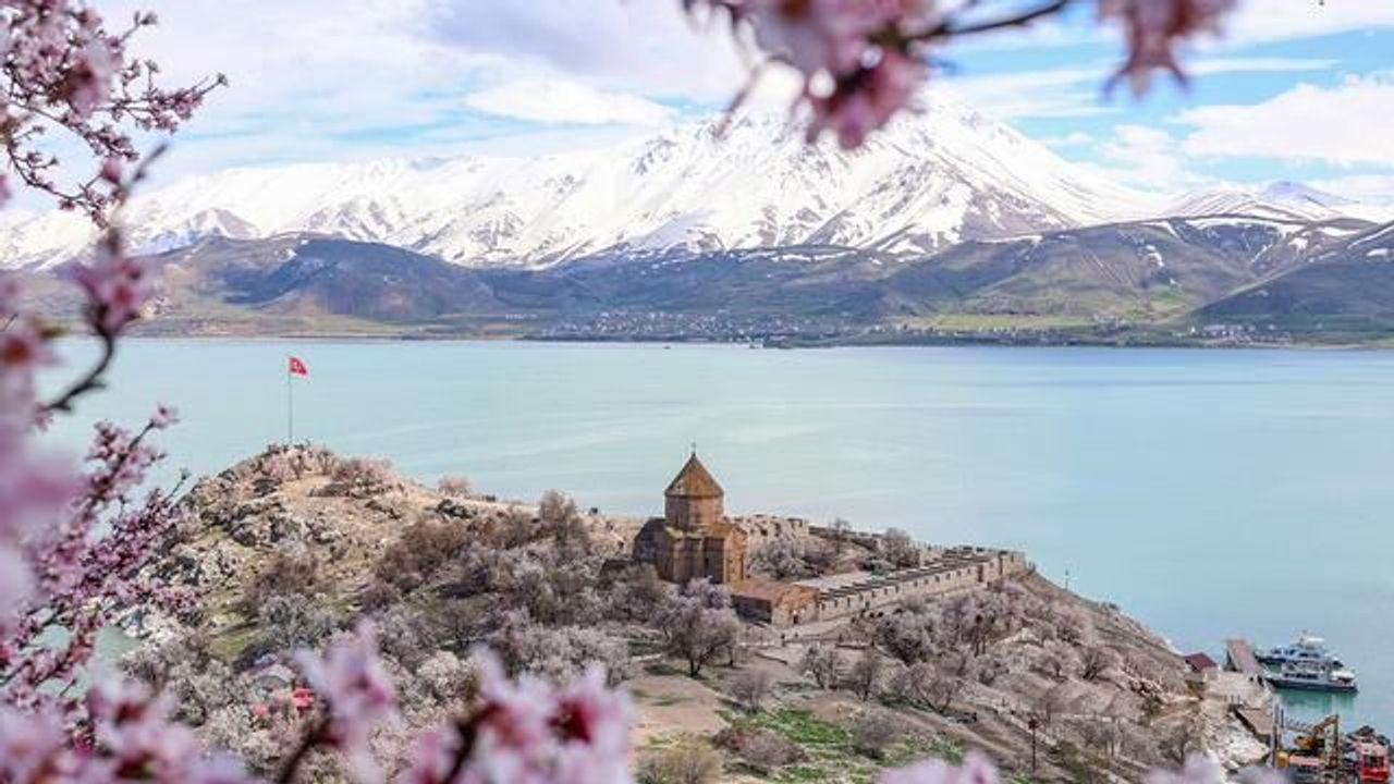 Van Gölü'nün incisi Akdamar Adası, baharın gelişiyle birlikte badem ağaçlarının beyaz ve pembe çiçekleriyle kaplandı. Bölgenin en çok ziyaret edilen noktalarından biri olan ada, doğal güzelliğiyle fotoğraf tutkunlarının ilgisini çekiyor.