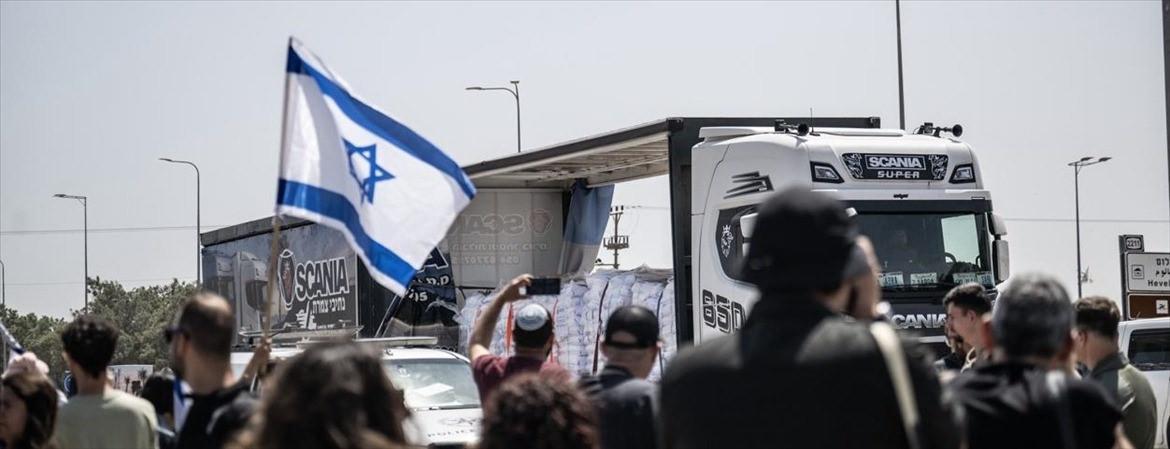 Aşırı sağcı İsraillilerin yolu kesmesi nedeniyle yardım tırlarının hareket edemediği kameraya yansıdı.