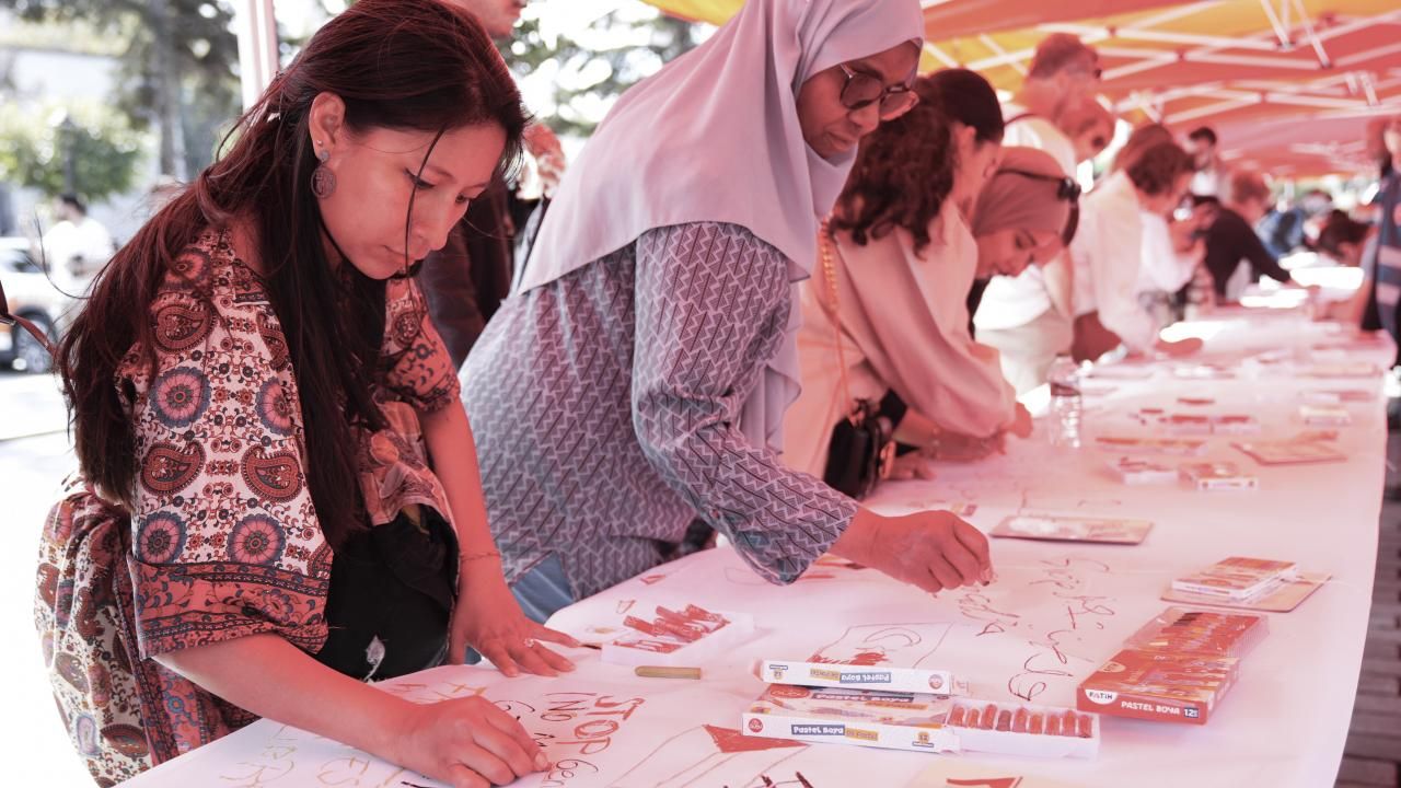 Yetişkinler ise Küresel Sumud Filosu ve Gazze'de İsrail'in yaptığı soykırıma ilişkin resimlere 'Free Palestine', 'Özgür Filistin', 'Bir Umuttur Sumud' ve 'Yaşasın Gazze' şeklinde yazılar yazdı.