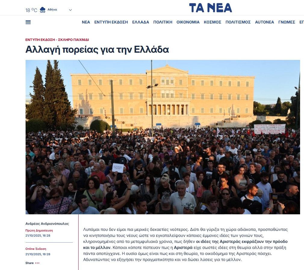 Yunan yayın organı Ta Nea yazarı Andreas Andrianopoulos, 21 Ekim 2025 tarihinde 'Yunanistan İçin Rota Değişikliği' başlıklı bir görüş yazısı yayınladı.