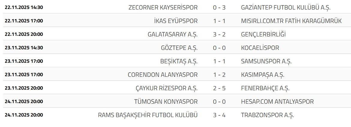 Sezonun 13. haftasının sonuçları, puan durumu ve 14. haftanın programı şöyle: